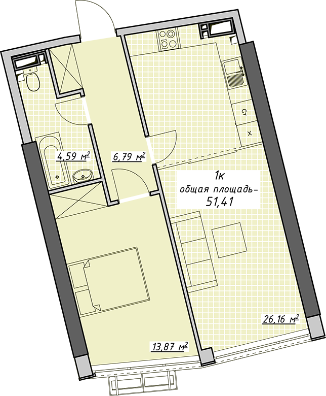 Поверх: 2Кімнати: 1Площа: 51.41 м2Здача: 12.2025